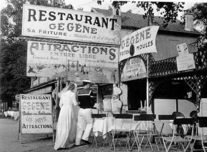 Le XIXe est le siècle de la Belle Époque et des guinguettes.Au Café de Flore le vin s’invite aux luttes entre artistes, écrivains et intellectuels ; au Procope Rosa Bonheur débat sur l’influence féminine tandis que les élégantes boivent du sancerre et dansent la valse.Au bord de Marne Chez Gégène, on trinque au petit vin blanc sous la tonnelle, le peuple vibre sur un air d’accordéon, le vin, symbole national, célèbre le bonheur simple, l’art de vivre.Si les guinguettes offrent aux femmes un espace de liberté, les excès d’alcool font des ravages.Lautrec immortalise ses héroïnes désabusées.L’utopie positiviste du début XIXe avec promesses de progrès et ordre social cède le pas à l’individualisme déchaîné.Miroir d’un siècle en effervescence, la Belle Epoque va ouvrir le débat sur le questionnement de la place de la femme dans l’art et la société.